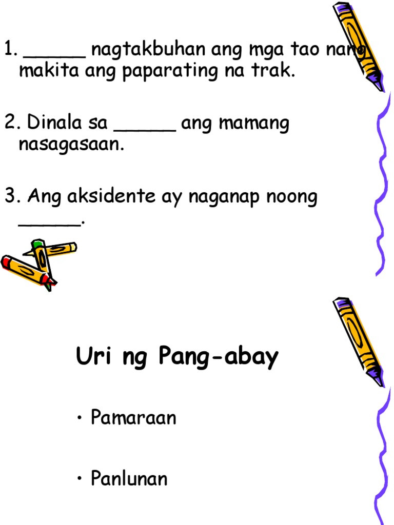 Pang-abay na nagsasaad ng pagtanggiAlin sa mga pangungusap ang nagpapakita nito. Ang dyanitor ay. The three kinds of pang-abay in these worksheets are pang-abay na pamaraan adverbs of manner pang-abay na pamanahon adverbs of time and pang-abay na panlunan adverbs of place.