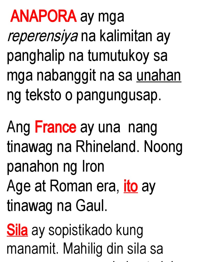 Ating tandaan na ang anapora ay isang pares ng pangungusap o isang pangungusap na mayroong ang tinutukoy ay nasa unahan samantalang. Flag for inappropriate content. Download as PPTX PDF TXT or read online from Scribd.