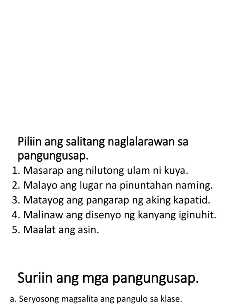 You can do the exercises online or download the worksheet as pdf. Nakikilala ang pang-abay na pamaraan. Pero kadalasan hindi natin nalalaman na ginagamit na pala natin ang mga ito.